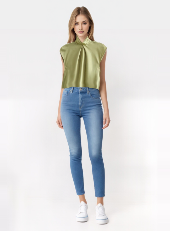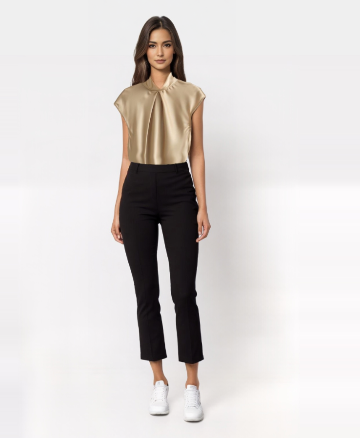 Elevate your wardrobe with the LYRA blouse, crafted from luxurious satin for a refined appearance. Its twisted high collar and sleeveless design offer a blend of chic style and comfort, ideal for both business and casual settings.